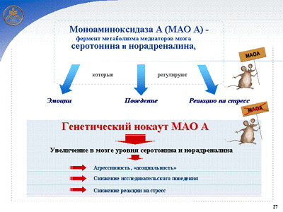 Совместными работами проф. Н.Поповой из нашего Института цитологии и генетики и сотрудников Института Кюри во Франции получены так называемые нокаутные линии мышей — линии, где заблокирован, выбит какой-то ген. Есть такая модель, где изучается ген МАО, который регулирует эмоции, поведение, реакцию на стресс. Если заблокировать ген, то в мозге увеличится уровень серотонина и норадреналина, что ведет к повышению агрессивности, асоциальному поведению, слабоумию. Появляется целый ряд других отрицательных моментов. Точно такая же патология найдена у человека. Это так называемое «голландское семейство», где четко показано, что блок данного гена вызывает резкую агрессивность и слабоумие.