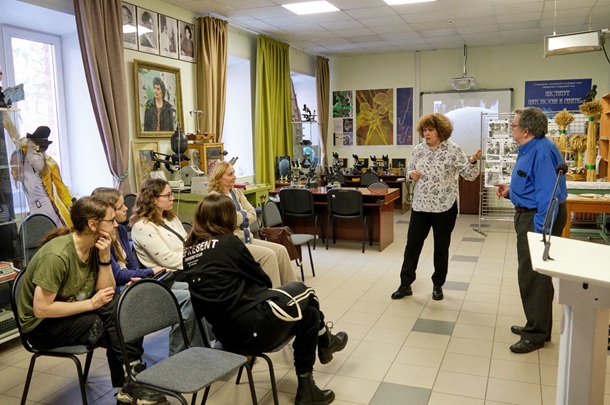 Студенты познакомились с историей института и знаменитым экспериментом академика Д.К. Беляева по одомашниванию лисиц, о котором им рассказал сын учёного и сотрудник ИЦиГ СО РАН — Михаил Беляев.