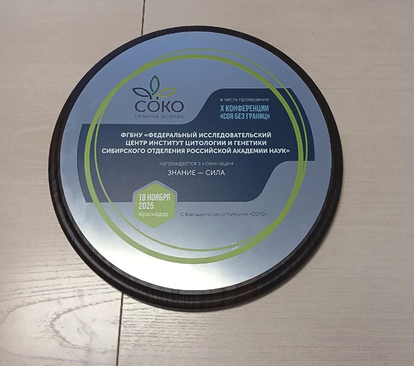На прошедшей X юбилейной конференции «Соя без границ» Институт цитологии и генетики СО РАН был награжден памятным знаком в номинации «Знание – сила». Наградой было отмечено многолетнее сотрудничество ученых института с компанией «СОКО».